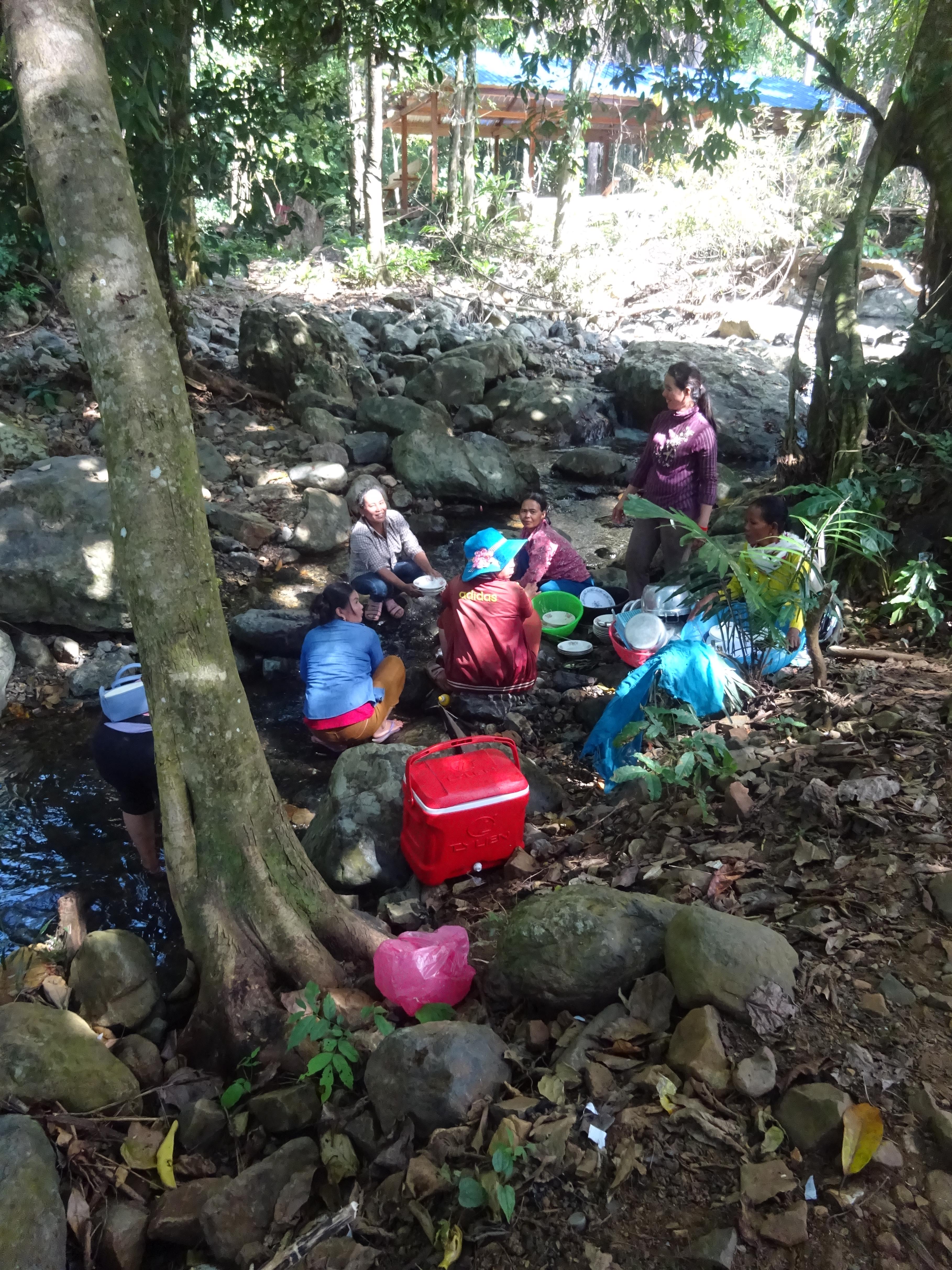 Les femmes de la communauté font la vaisselle dans la rivière
