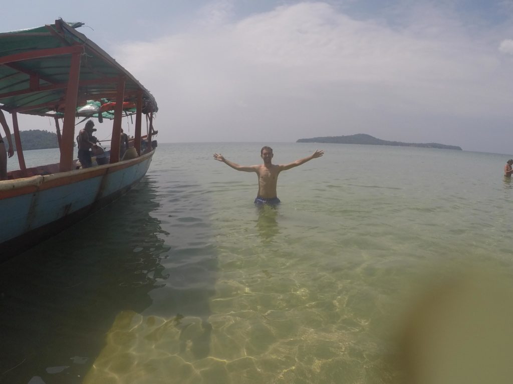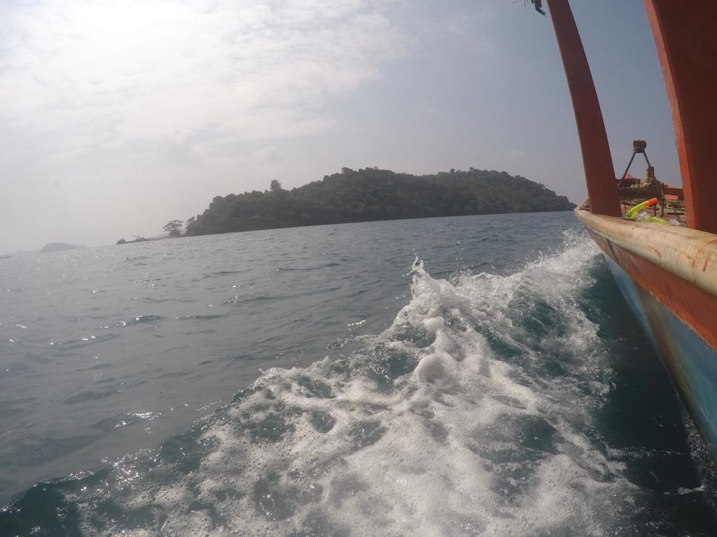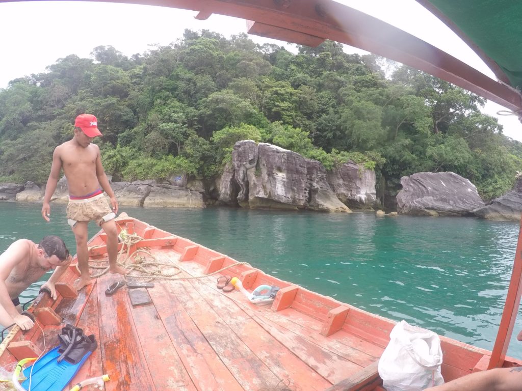 Le lendemain, pour conclure mon voyage, j’avais réservé une excursion en bateau sur les îles voisines. J’ai passé la journée dans un groupe de dix touristes emmenés par notre conducteur de bateau cambodgien qui nous a fait voir plusieurs sites d’intérêts sur des îles presque désertes. Au programme : snorkeling, relaxation sur la plage, barbecue et plongeon depuis un rocher.