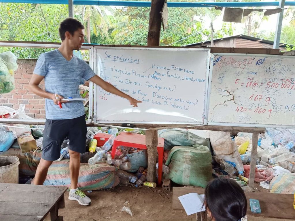 Le temps passe vite ici au Cambodge et je m’apprête déjà à rentrer dans le dernier mois de ma mission. Durant mes premières semaines, il m’a fallu un peu de temps pour trouver ma place et le sens de ma présence ici. Pendant cette période d’adaptation, mon attitude était un peu passive et je me contentais de laisser les choses se dérouler à leur rythme bien que trop lent pour moi. Mais cette période est révolue, j’ai maintenant trouvé le sens que je voulais donner à ma mission et j’ai décidé de suivre mon propre rythme. L’éclair est venu de l’école Beehive School. Alors que mon emploi du temps jusque-là ne comptait qu’un cours d’anglais d’une heure chaque soir, un peu de préparation avant et quelques visites très ponctuelles des communautés alentours pour assister mon collègue Riethy, j’ai vu passer une annonce sur Facebook pour donner des cours de français/anglais à des enfants. J’ai sauté sur l’occasion de remplir un peu plus mes journées et de faire ce pourquoi j’étais venu au Cambodge : du volontariat. Ainsi j’ai découvert Beehive School, une école au fonctionnement atypique. Contrairement aux écoles publiques où les parents doivent payer quelques dollars tous les mois pour que leurs enfants puissent être inscrits, les cours à Beehive School sont gratuits. Enfin pas totalement … ici la monnaie d’échange utilisée est le sac plastique ! Chaque jour, les enfants doivent amener des emballages plastiques usagés à l’école en échange de l’instruction. Ces sacs collectés sont utilisés par l’école avec l’aide des enfants pour fabriquer des écobriques, des « briques » faites à partir de bouteilles plastiques remplies d’emballages plastiques tassés qui peuvent ensuite être utilisés dans des constructions : banc, table, muret, délimitation d’espaces verts … Un moyen de donner une seconde vie au plastique et de sensibiliser les enfants au problème des déchets dont le Cambodge souffre. Dans cette école, seules les langues sont enseignées : anglais, français et allemand. Me concernant j’y donne des cours de français avec un peu d’anglais à raison de 2 heures par semaine. Comme les horaires se chevauchent avec mes cours d’anglais à l’école d’Anlong Vil, je ne peux enseigner qu’à la classe de niveau débutant composée d’enfants de 5 à 13 ans.