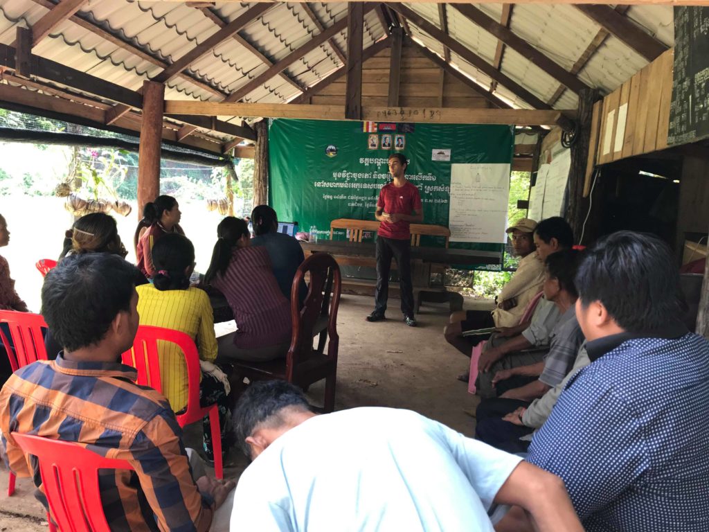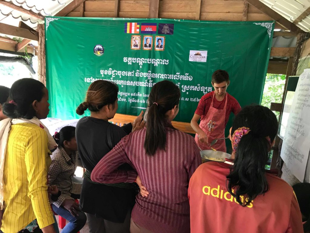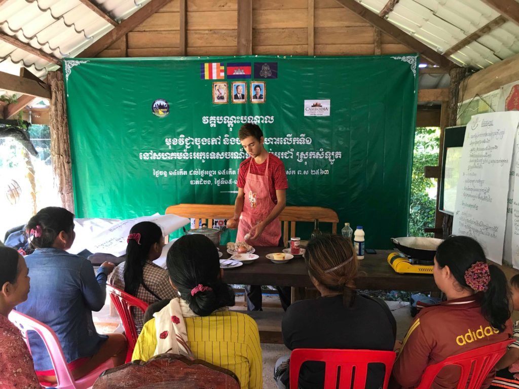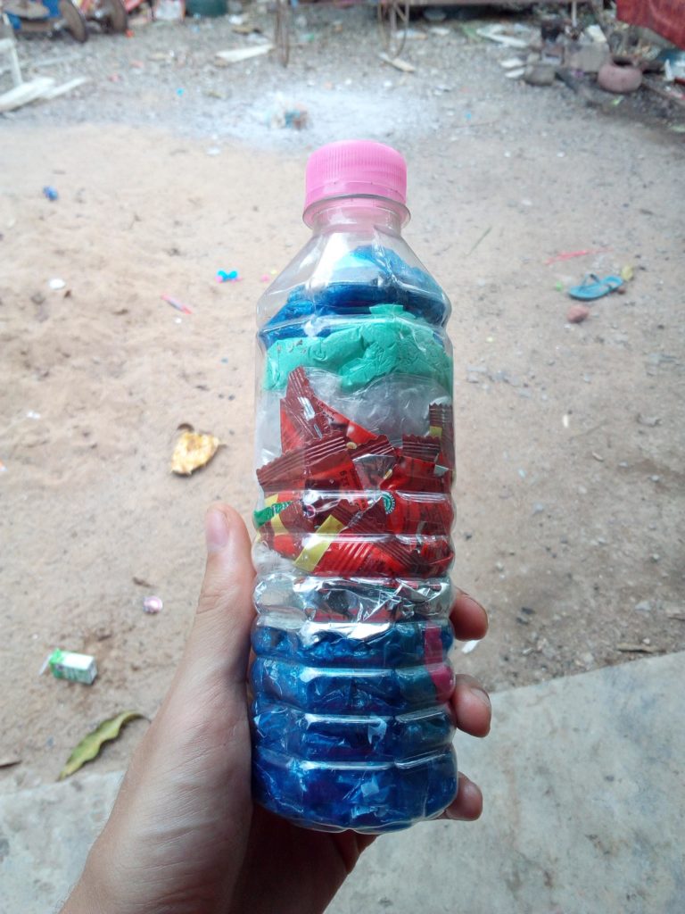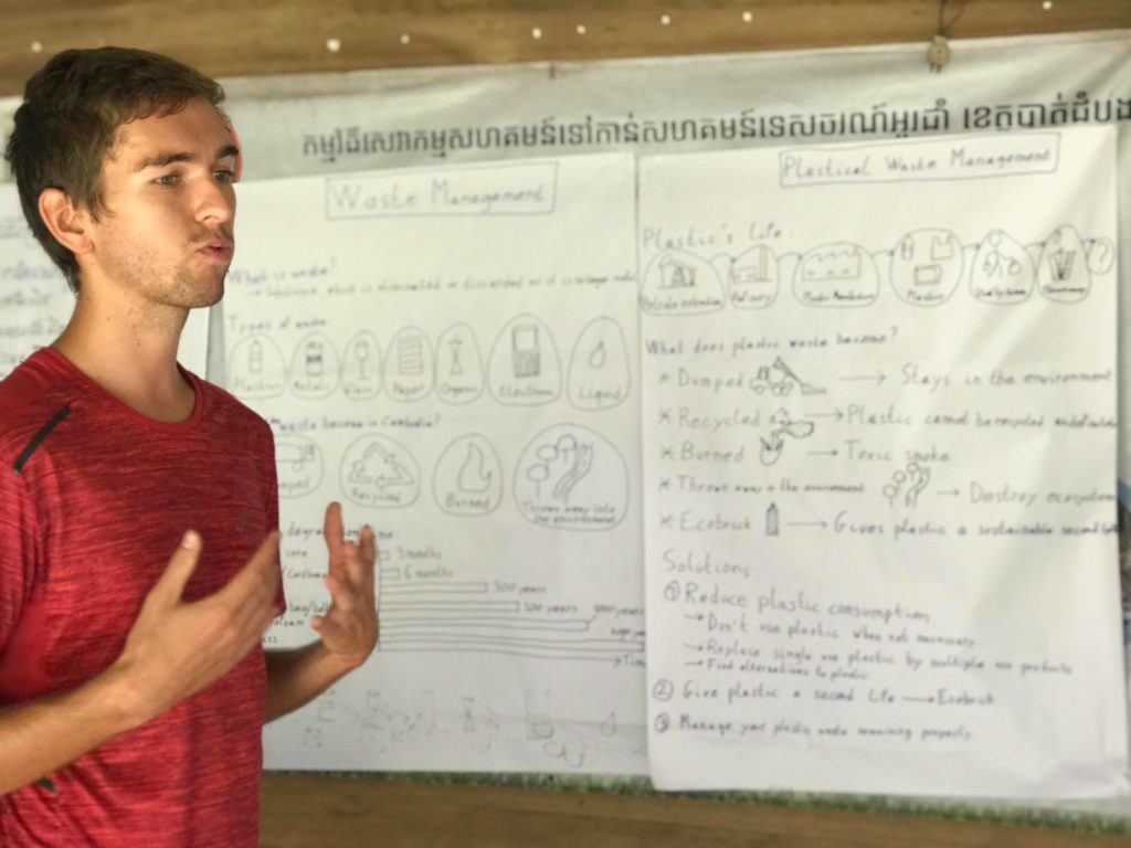 En plus du cours de cuisine, j’ai également dispensé un cours de gestion des déchets devant l’ensemble de la communauté. Ce sujet est vraiment problématique au Cambodge car le pays manque cruellement d’infrastructures pour traiter tous les déchets qu’il produit. A part dans les très grandes villes, aucun système de collecte des ordures n’existe. Les habitants doivent donc s’en occuper eux-mêmes. Les deux seules alternatives qui s’offrent à eux sont soit de les brûler, mais cela produit des fumées toxiques, soit de s’en débarrasser directement dans l’environnement. Cependant, grâce à ce que j’ai appris à Beehive School, j’ai pu leur présenter une troisième solution : celle des écobriques.