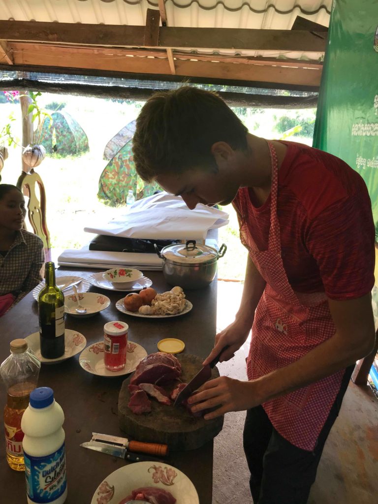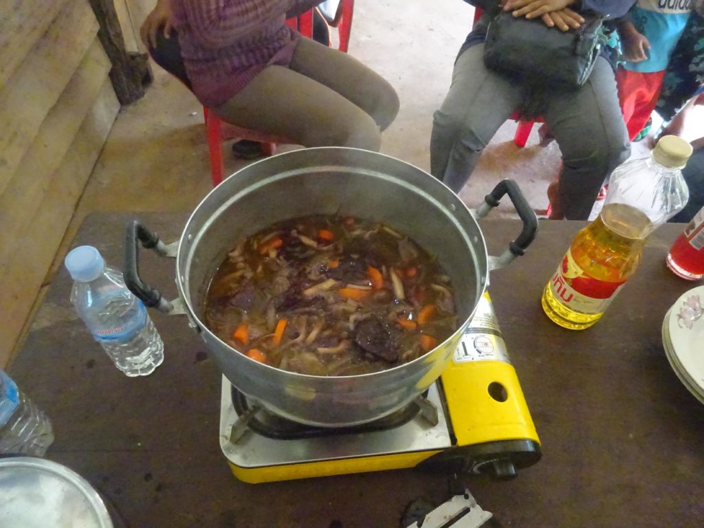 En ce qui me concerne j’ai eu la responsabilité de dispenser un cours de cuisine française aux femmes de la communauté. Au menu : bœuf bourguignon et crêpes. Le bœuf bourguignon a été plutôt une réussite même si les ingrédients dont je disposais étaient un peu différents de ceux trouvés en France. Les cambodgiens ont eu l’air de bien apprécier la recette et étaient étonnés de ne presque pas sentir le goût du vin alors que j’en avais versé presque une bouteille entière.
