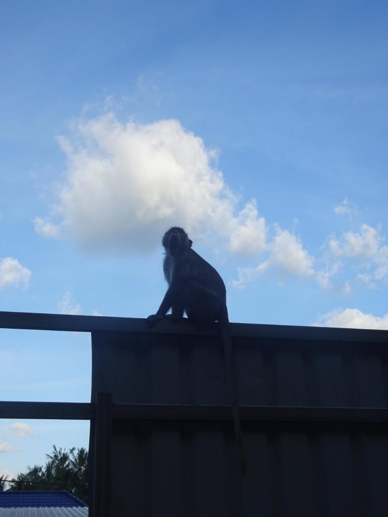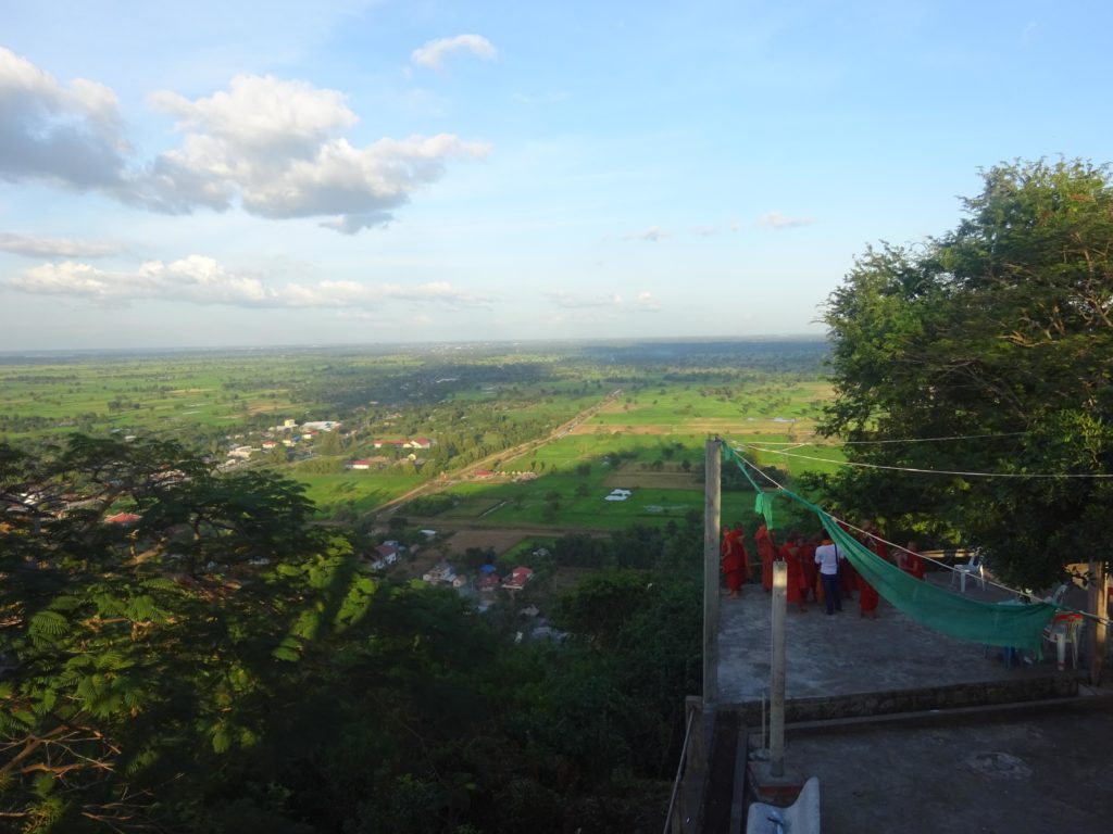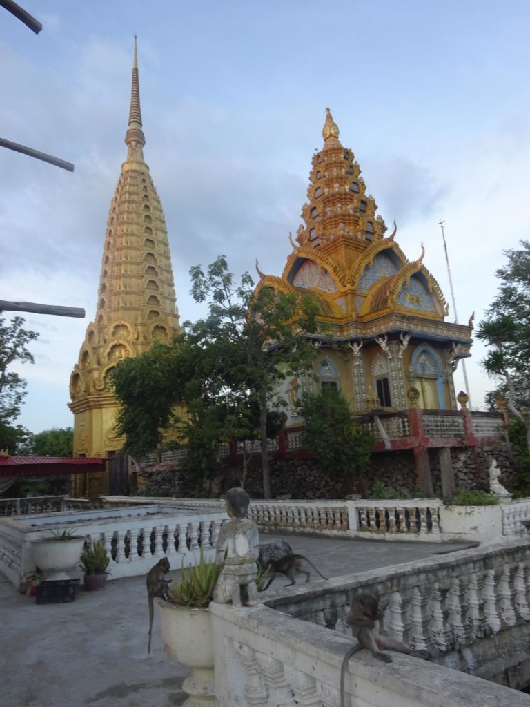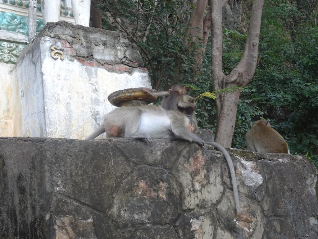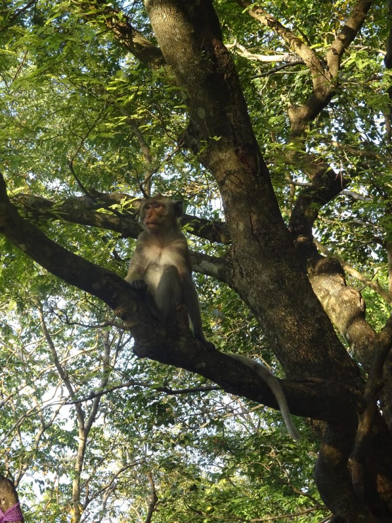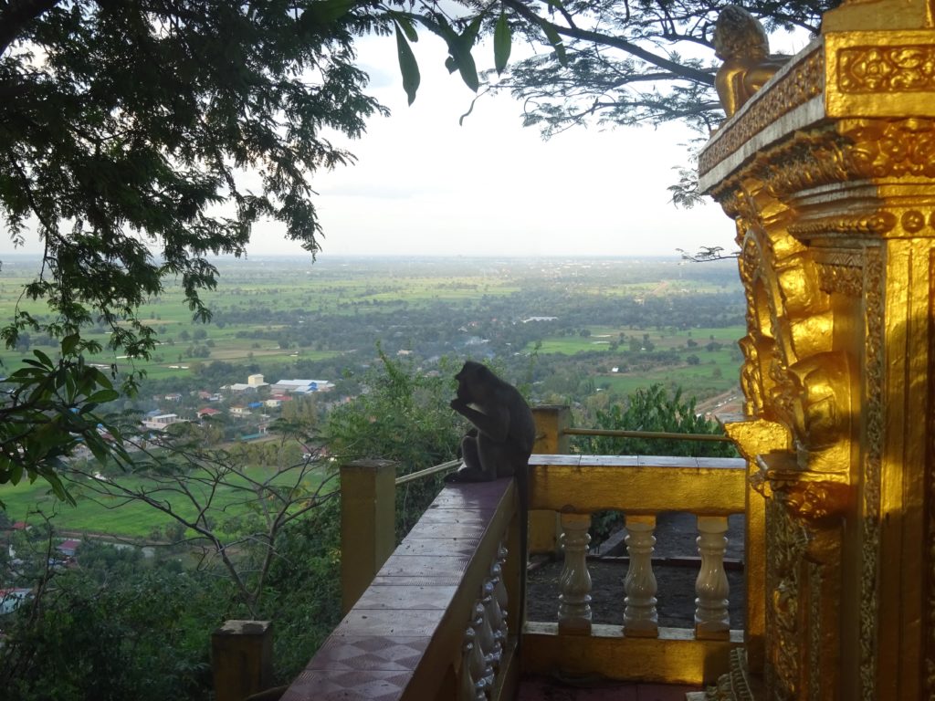 Pendant mon temps libre, j’ai aussi approfondi un peu mes visites de la région. Je suis notamment allé visiter dernièrement Samphov Mountain, une colline surmontée de temples et abritant des grottes, le tout à une quinzaine de kilomètres de Battambang, rien d’insurmontable à vélo. J’avais entendu dire que la colline abritait des singes et j’espérais pouvoir les voir cette fois comme je les avais manqués dans la jungle. Le suspense aura été de courte durée. A peine arrivé, une poignée de macaques attendent les touristes en bas des marches grimpant sur la colline. Et ce n’est qu’un échantillon, les singes jalonnent les escaliers menant au sommet en espérant que des touristes veuillent bien les nourrir. Il vaut mieux garder sa nourriture dans son sac ici. Une fillette en a fait les frais. Elle a dû abandonner, à son grand désespoir, la fin de son gâteau au profit d’un singe qui l’avait repéré. C’est la première fois pour moi que je vois des singes en liberté. On ne peut cependant pas dire qu’ils sont à l’état sauvage, leur présence est intimement liée à celle des Hommes. Je suis ébahi par leur comportement tellement semblable à celui des humains. Dans un coin, deux macaques, l’un déguste le quatre-heures abandonné par la fillette en prenant soin de bien déchirer l’emballage et l’autre se désaltère avec une bouteille d’eau qu’il ouvre sans aucune difficulté.