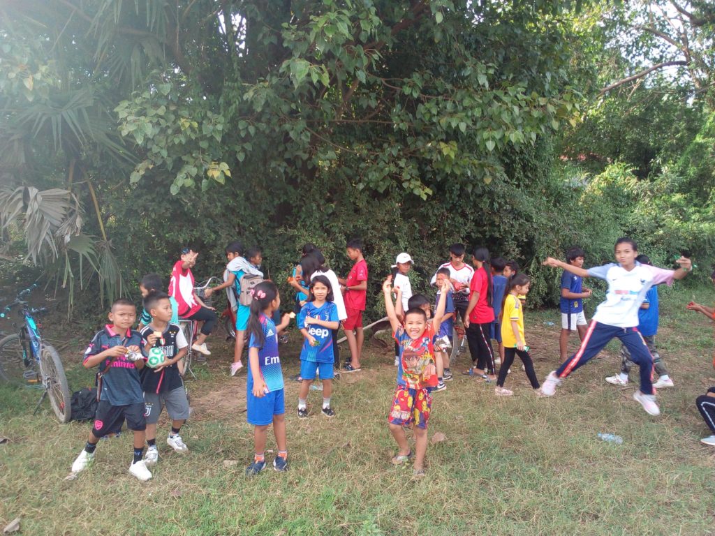 Ce dimanche, j’ai organisé un après-midi de jeux d’extérieur avec les enfants de Beehive School pour leur faire découvrir les jeux français et passer un bon moment tous ensemble. Je me suis donc transformé en animateur de centre aéré le temps d’un après-midi. La première étape a été de trouver un terrain adapté, c’est-à-dire suffisamment grand et ombragé car il fait plus de 30°C en plein après-midi. Il s’est trouvé que le seul dans les alentours qui répondait à ces critères était un champ habité par quelques vaches qui avaient laissé de gros trous dans le sol. Plus d’une trentaine d’enfants avaient répondu à l’appel. Heureusement, un ami professeur d’anglais et le directeur de l’école étaient venus m’aider. Ce qui n’était pas de trop pour gérer toute cette petite troupe bien excitée et pour m’aider à expliquer les règles des jeux en traduisant en Khmer. Au programme de l’après-midi : Tomate, Passe à 10, Balle aux prisonniers et Dobble.