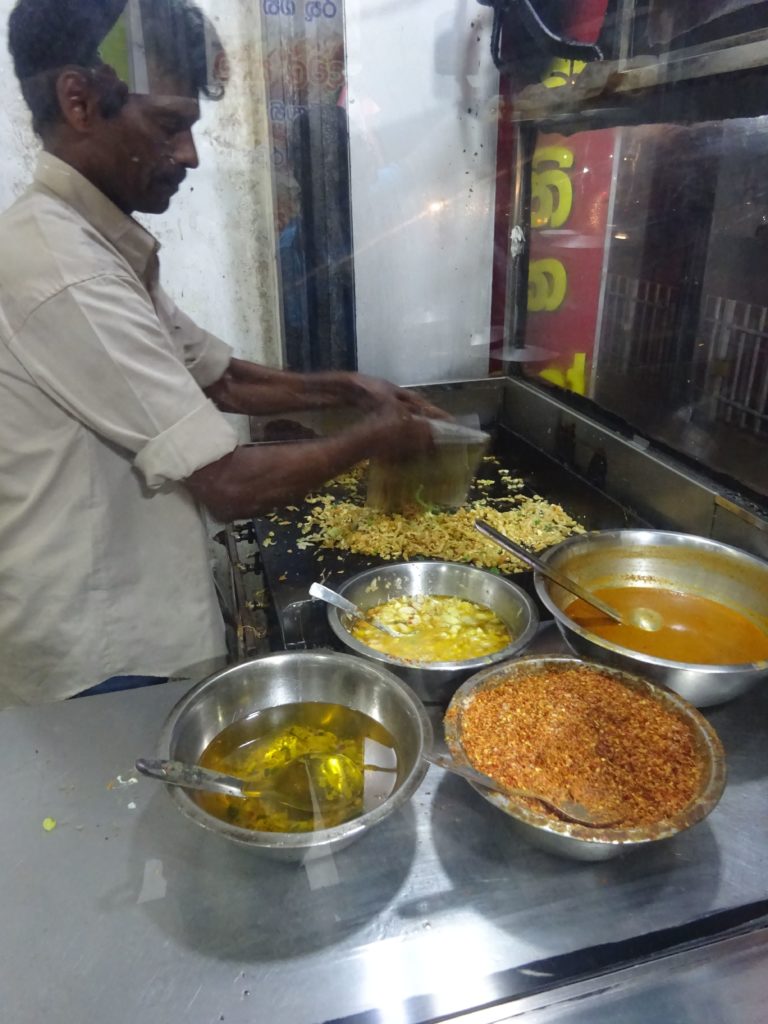 Arrivés à Nuwara Eliya, la température avait nettement diminué et une averse nous attendait. La première pour moi depuis 2 mois et demi. Mais heureusement nous avons pu nous réchauffer et nous restaurer autour d’un excellent Cheese Kottu concocté par notre hôte Sam. Le Kottu est un plat Sri Lankais à base de roti (pain plat rond), de légumes, d’œufs et de viande assaisonné avec quelques épices. Le tout est cuit sur une plaque métallique chaude sur laquelle les différents ingrédients sont réduits en petit morceaux à l’aide de lames en métal dans un grand fracas.