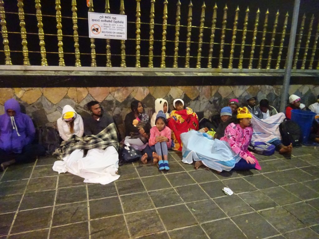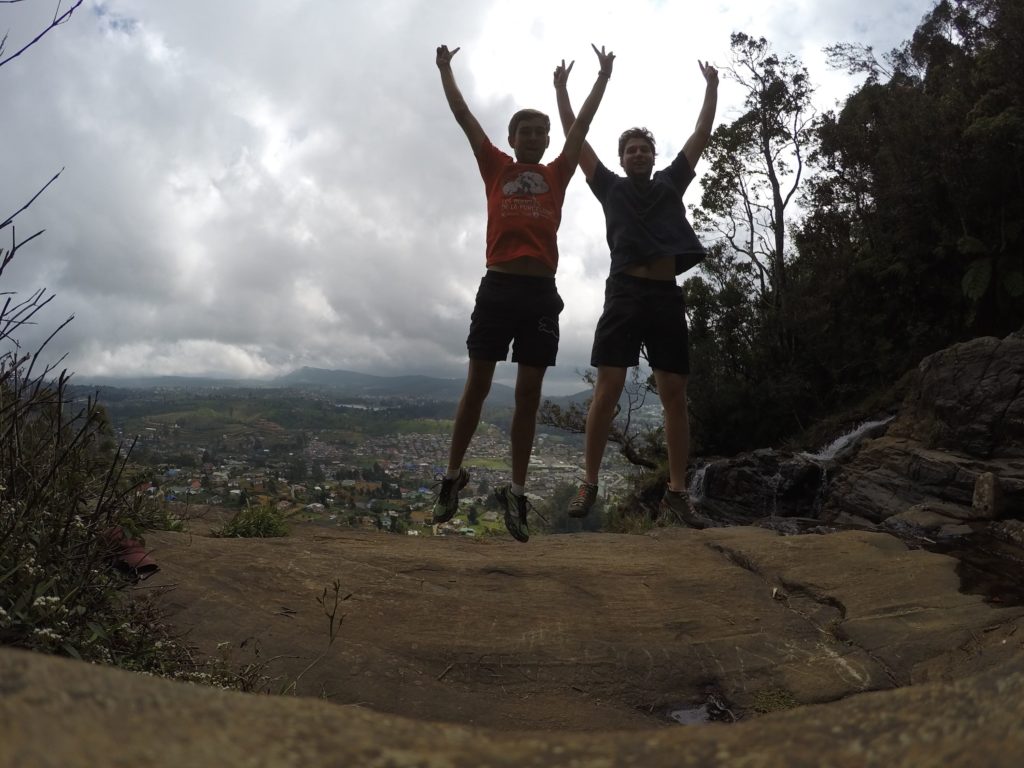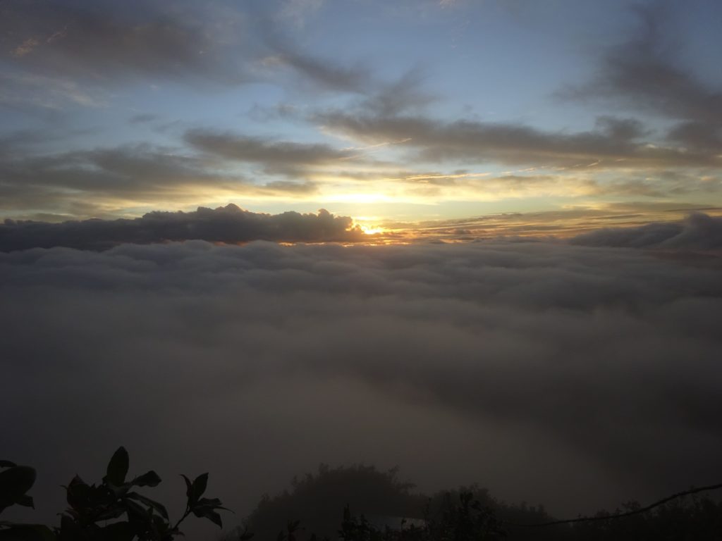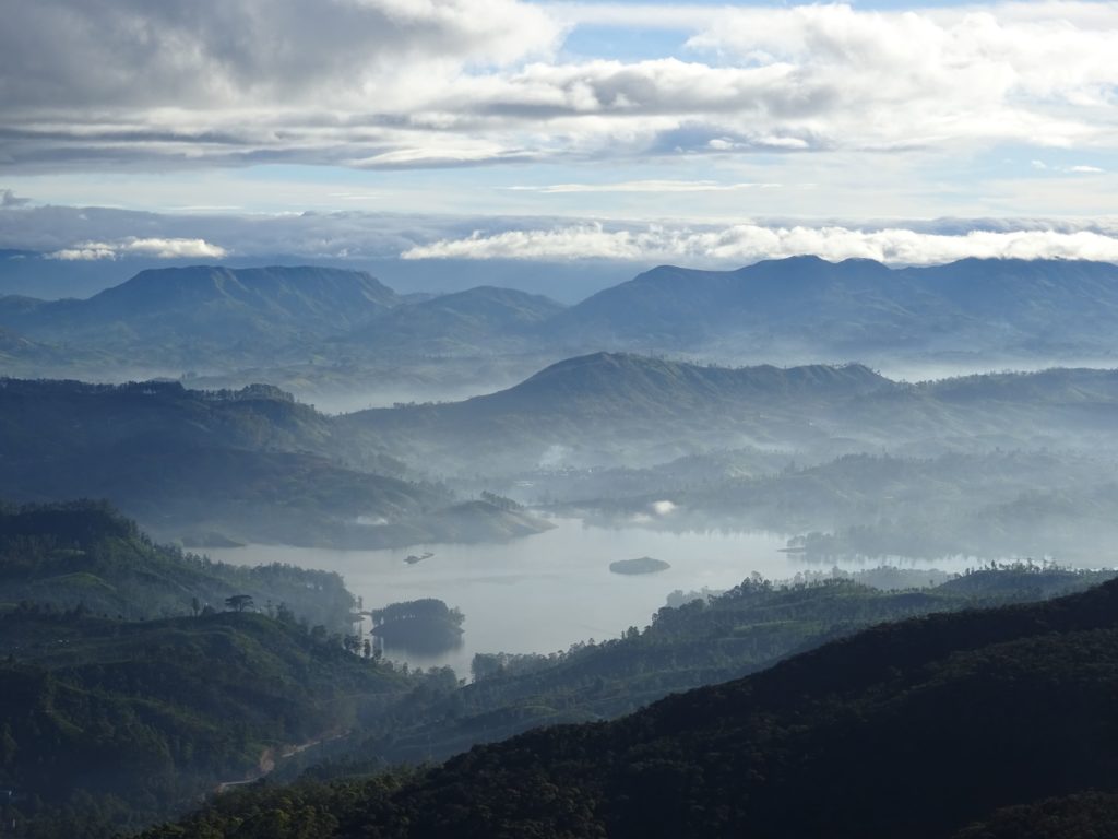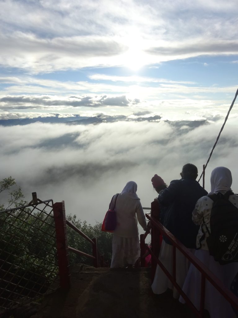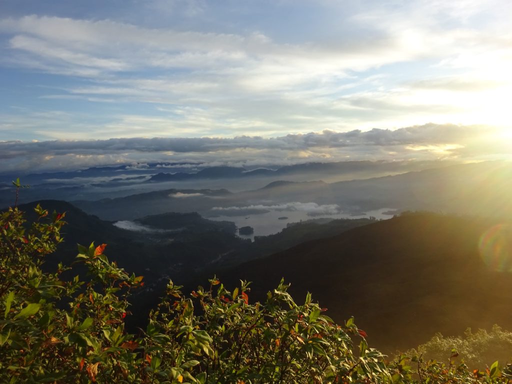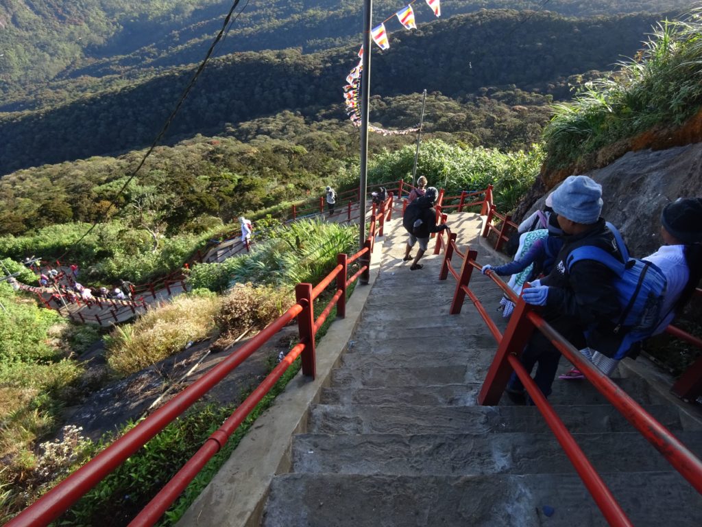 Après cette belle rencontre, nous avons pris la route de Nallathanniya pour la dernière étape de notre parcours commun avec Maxence : l’ascension de l’Adams Peak, la deuxième montagne la plus haute du Sri Lanka culminant à 2240 mètres et qui est surtout un des lieux les plus sacrés de l’île. A son sommet se trouve une empreinte de pied géante appartenant à Bouddha d’après les bouddhistes. Les musulmans l’attribuent quant à eux à Adam (d’où le nom de l’Adam’s Peak) alors que les hindous y voient la trace du passage de Vishnu ou encore de Shiva. Depuis le pied, un escalier mène en haut via quelques 5500 marches qui se font de plus en plus grandes au fur et à mesure que l’on s’approche du sommet. L’ascension se fait en général de nuit pour arriver en haut pour le lever du soleil. Nous avons donc pris le départ à 3 heures du matin pour nous joindre au flot de personnes venue faire la montée, un mélange de touristes et de fidèles. L’ascension nous a pris un peu moins de 2 heures ce qui est plus rapide que les estimations que nous avions lues. Mais sur le chemin nous avons réalisé que notre exploit était bien maigre par rapport à celui d’autres personnes croisées en route. Parmi elles, des parents avec leur enfant dans les bras et des dames âgées qui gravissaient les marches une à une en se tirant péniblement à l’aide de la rampe, tous guidés par leur seule foi religieuse. Une fois arrivés en haut, des centaines de Sri Lankais étaient déjà massés, blottis dans des couvertures pour lutter contre le froid et le vent glacial présents au sommet. Nous avons fait de même avec nos vêtements les plus chauds et nous avons patiemment attendu le lever du soleil. Malheureusement des nuages sont venus un peu contrecarrer notre plan mais nous avons tout de même eu quelques fenêtres pour admirer le magnifique paysage qui s’offrait à nous.
