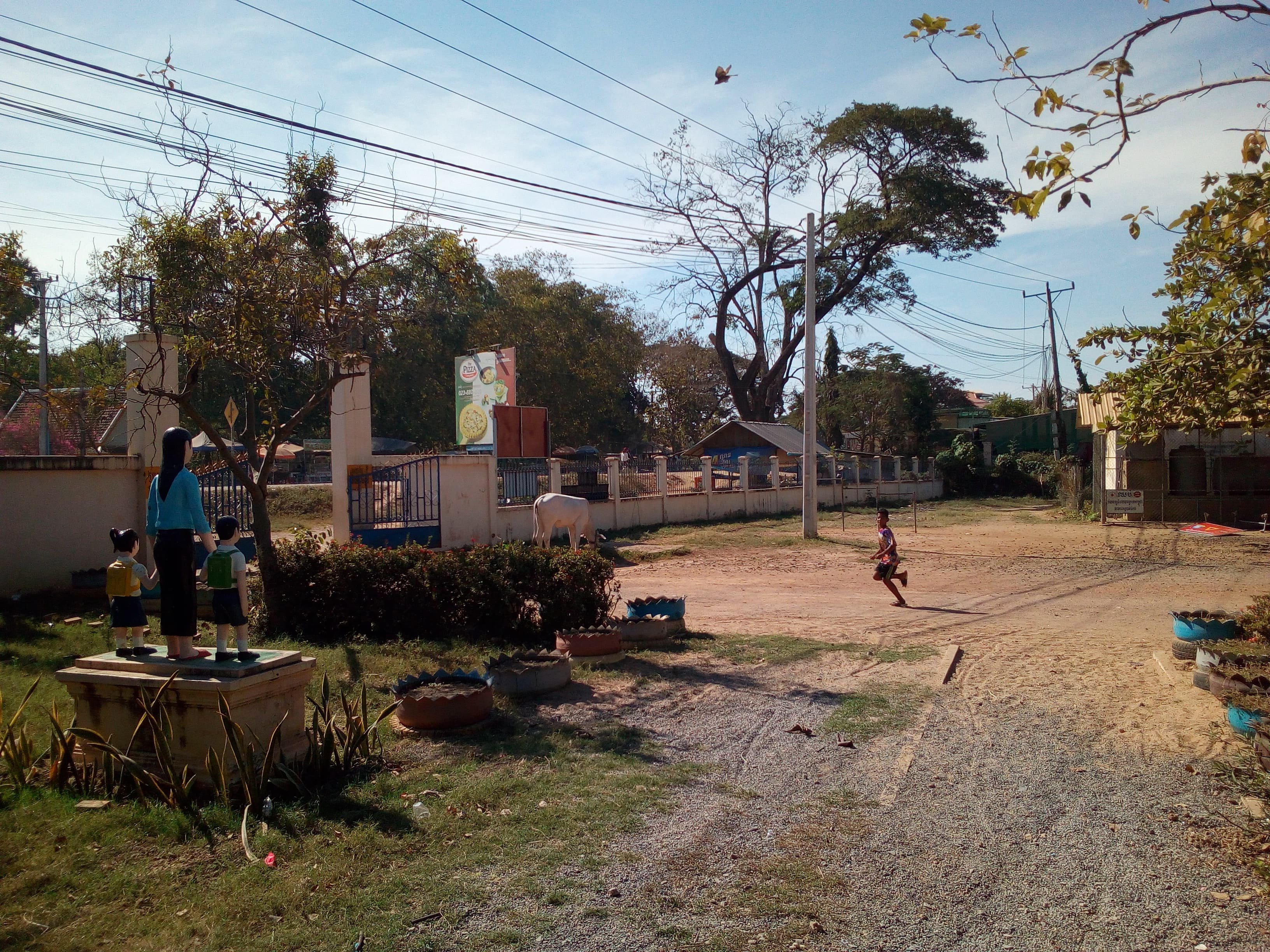 L’entrée de mon école d’Anlong Vil avec un enfant … et une vache