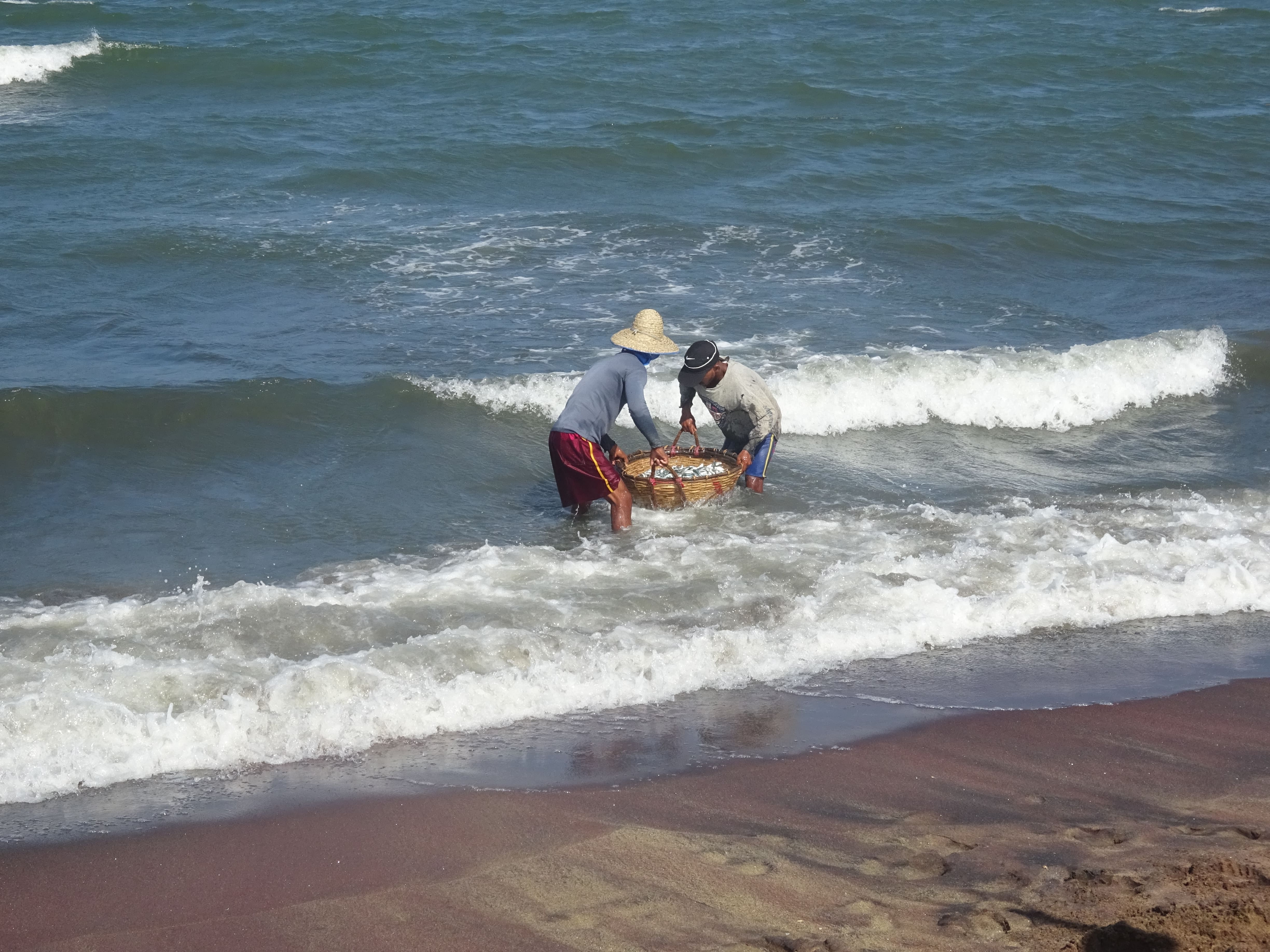 Rinçage des poissons avant de les mettre dans un grand bidons avec du sel et de l’eau pendant plusieurs heures. Ils seront ensuite séchés sur le sable.