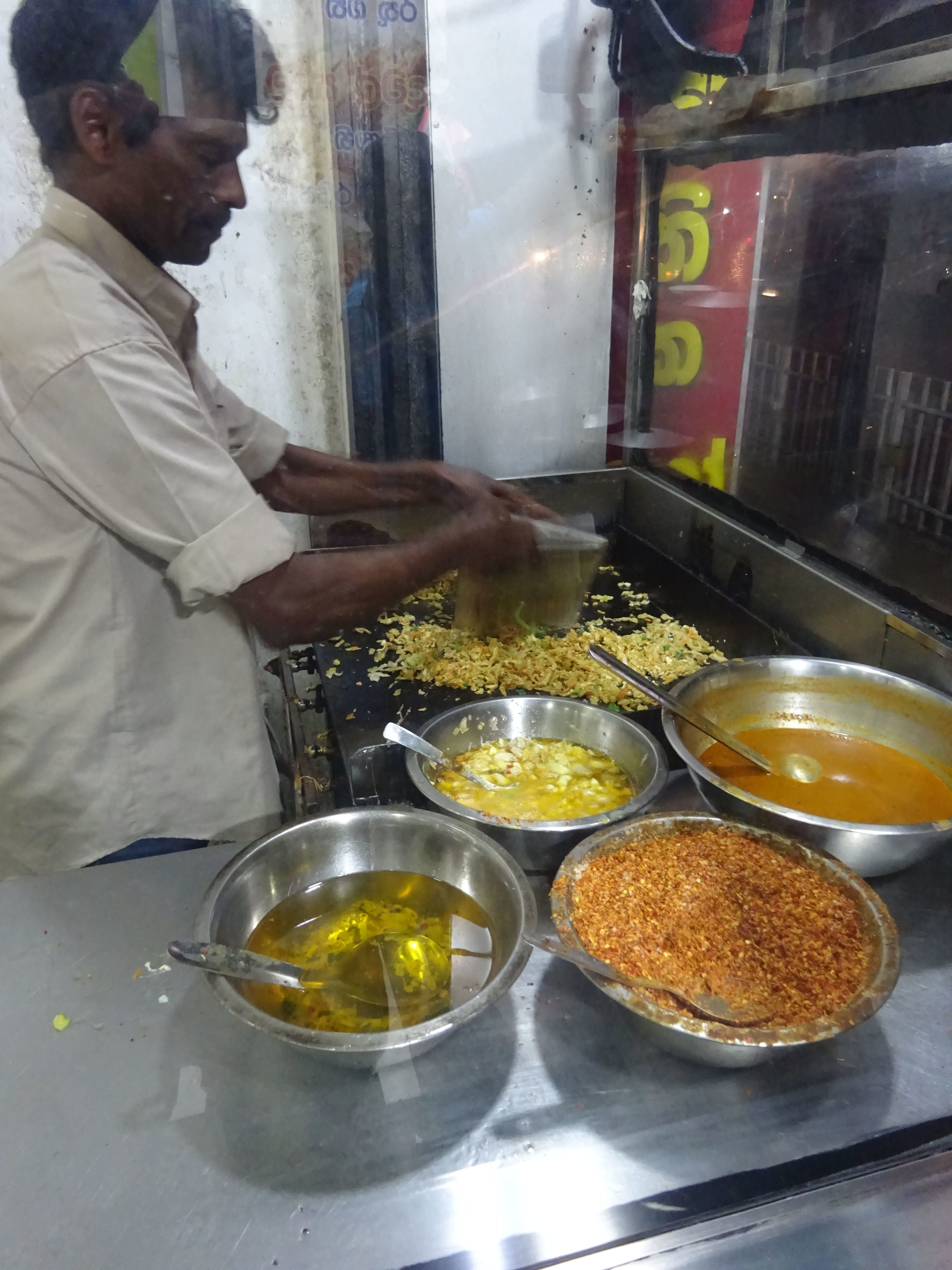 536 ← Précédent Suivant → Préparation du Kottu en hachant les ingrédients à l’aide de plaques métalliques dans un grand fracas.