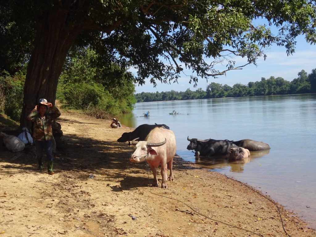 Le départ de Battambang n’est pas très agréable. La vue depuis la rivière n’est pas des plus plaisantes puisqu’on ne peut ignorer les tonnes de déchets qui jonchent les rives. La gestion des déchets est un problème majeur au Cambodge et ceux-ci, lorsqu’ils ne sont pas brûlés, sont souvent jetés directement dans l’environnement. Et immanquablement tous ces déchets se retrouvent dans la rivière où ils sont charriés lors des crues et restent pour beaucoup coincés sur les rives lorsque la décrue s’amorce.