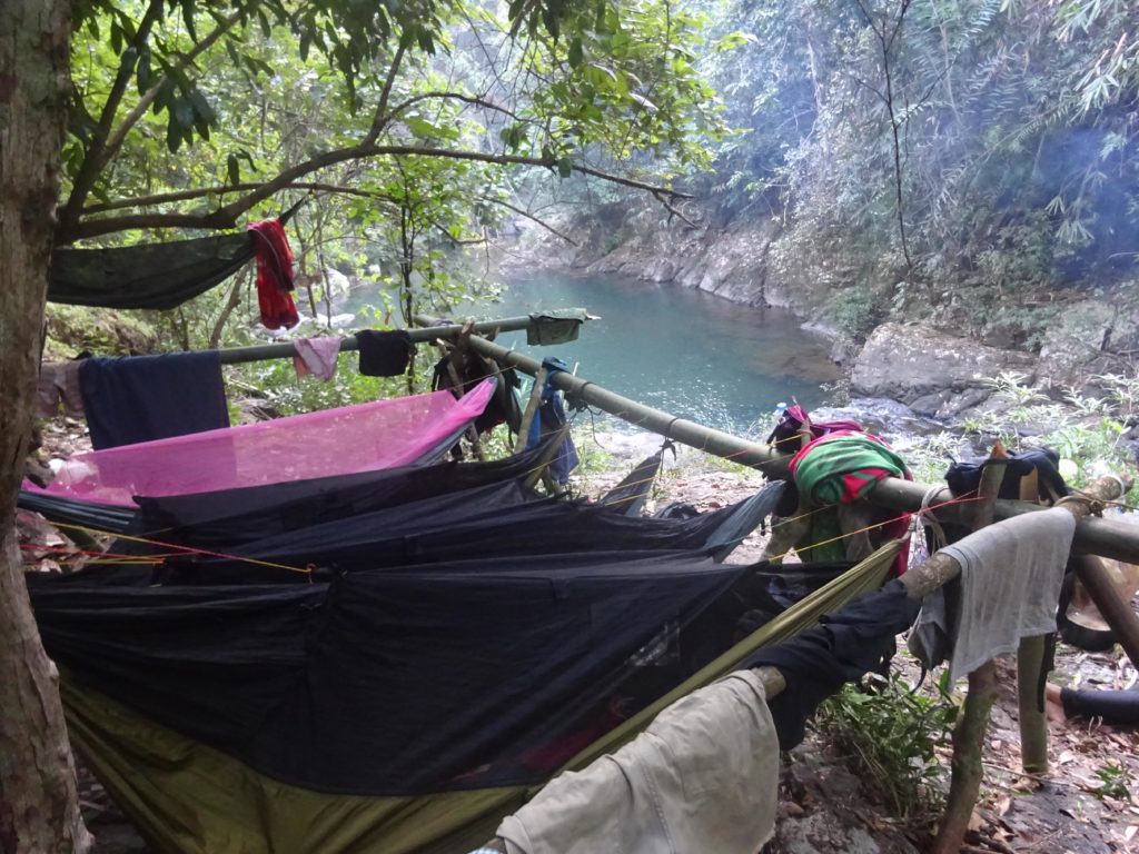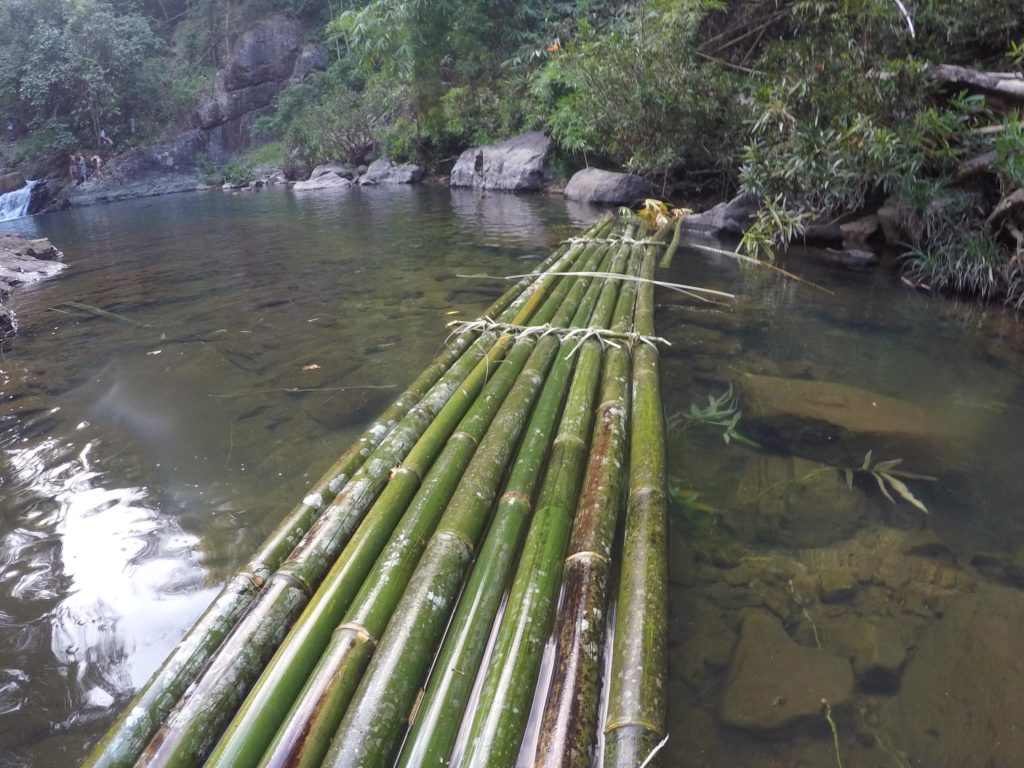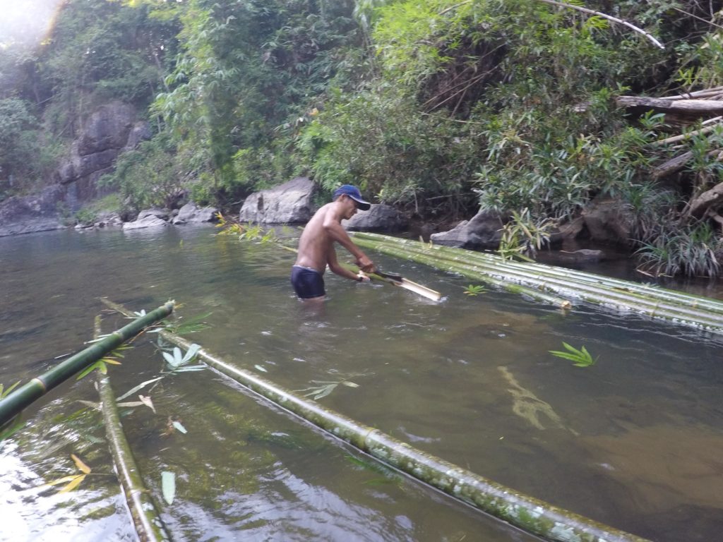 Plus loin sur notre parcours, à un endroit où la rivière est large, nous rencontrons des pêcheurs d’un autre style. Ils pêchent depuis une sorte de bateau-grue qui leur permet de remonter leur filet rapidement pour piéger les poissons.
