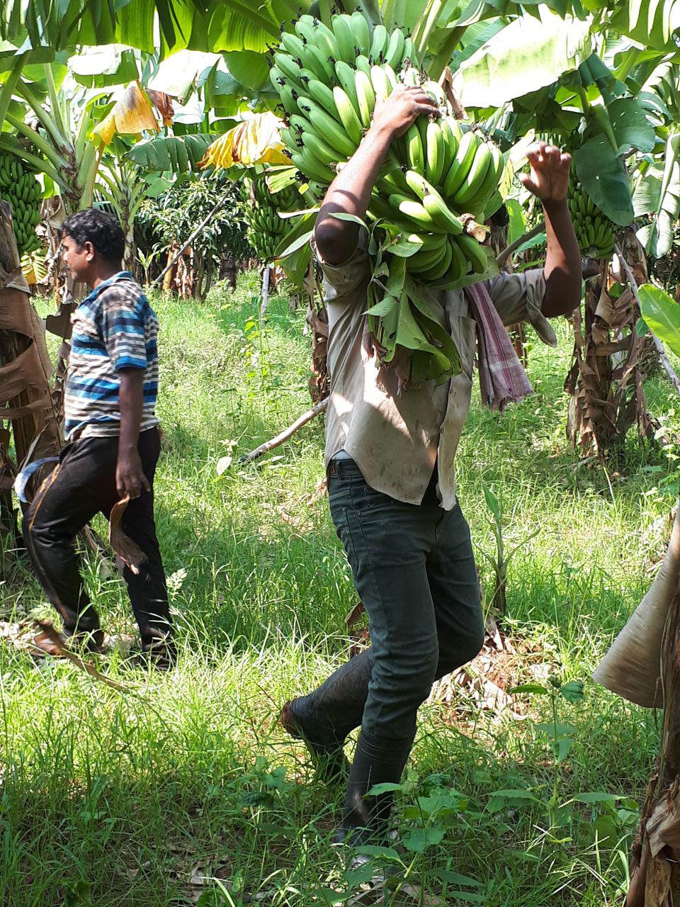 Du mercredi au samedi matin, je me suis occupé de la mise au propre des bananiers. Parmi les trucs amusants, je citerai en vrac le soin de la pate d’une vache en lui faisant une prise de catch et une battue au lapin sur la propriété, sans armes (car elles sont interdites en inde). Ainsi, la battue se fait avec 6 ou 7 personnes qui marchent dans les champs de bananiers, en ligne, et entres elles circulent un chien. Lorsqu’un lapin est levé par l’une des personnes, le chien lui cours après (au lapin) et essaie de l’attraper. Une sorte de battue inversée. Malheureusement, c’est quand même moins efficace, et si nous avons vu 2 lapins, le chien n’a pas était assez rapide.